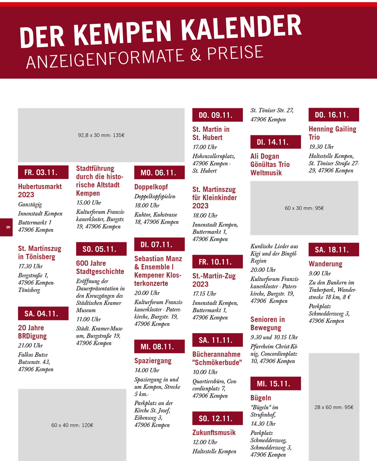 Eine sorgfältige Platzierung im Magazin ermöglicht, die Zielgruppe noch besser zu erreichen. Und der Leser ist aufnahmebereiter, wenn er diese Informationen innerhalb seines gewohnten redaktionellen Umfeldes erhält. Die Redaktion von KempenKompakt garantiert seinen Kunden dabei mit Intelligenz, Kompetenz und – wenn es das Thema verlangt - auch Witz geschriebene Texte. Und unsere Grafik sorgt für eine Gestaltung, die Ihre Werbebotschaft auch optisch überzeugend transportiert. Das gilt auch für eine Spezialform des Advertorials, das Testimonial (engl.: Zeugnis): Hier steht eine Person mit ihrem Gesicht und Renommee für ein Angebot ein. Ein nicht oft genutztes, aber sehr wirksames Marketing- Instrument. Ob Arztpraxis oder Anwaltskanzlei, Autohaus oder Geldinstitut, Fachhändler oder Fitness-Studie – die auf diesen Seiten abgebildeten Beispiele zeigen das breite Spektrum unserer Möglichkeiten.